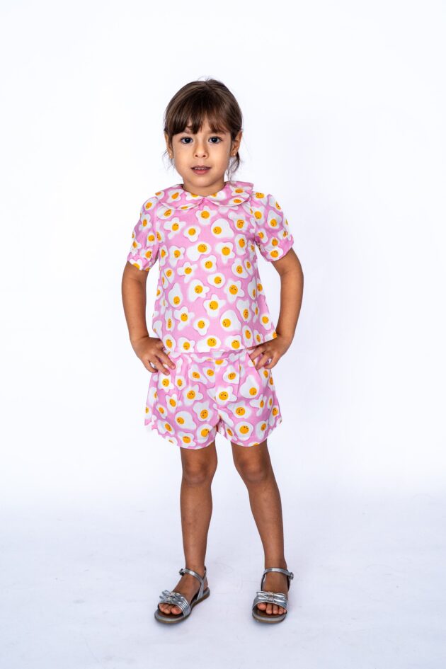 Fechamento e nas costas com botão pequeno amarelo.