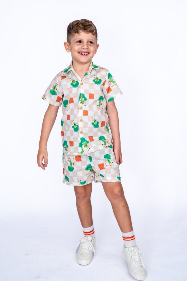 Camisa confeccionada em tecido 100% algodão, na estampa Broc, com fundo grid nas cores bege e off white, com desenhos de brócolis fazendo diversas atividades, como andar de patinete.