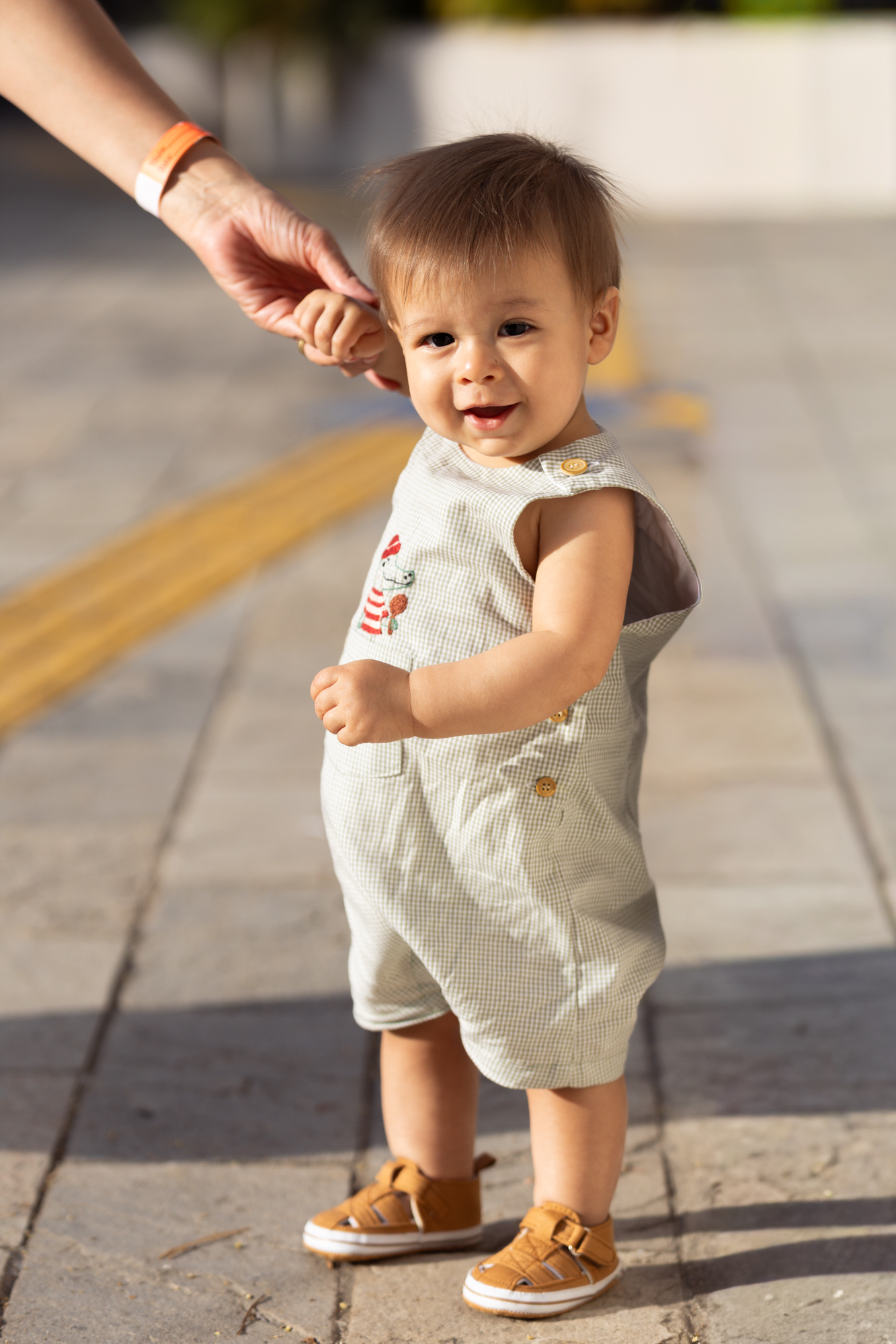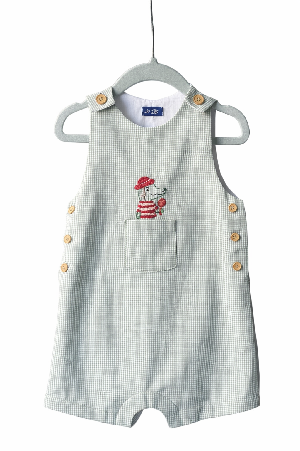 Jardineira fresquinha confeccionada em tecido 100% algodão, com estampa xadrez verde e branco.