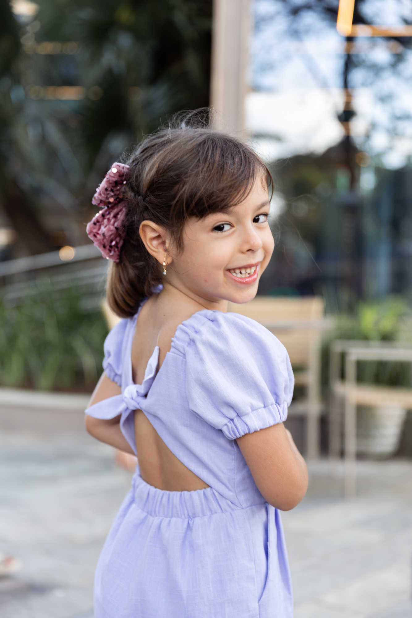 Fechamento nas costas com laço, que acrescenta charme e um toque especial ao visual